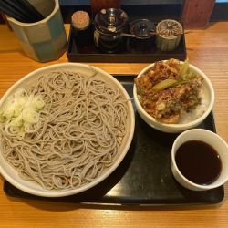 ツルツルのそばに濃い目のタレがかけられたかき揚げ丼のセット。美味しく満足度高いです。