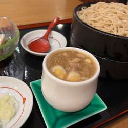 盛り汁は濃く甘みも強く、粗めの挽肉の様な鴨肉が入っており鴨油も多く感じる。