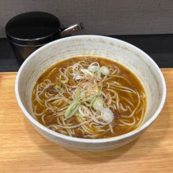 直前にカレールーをそばつゆで溶いで提供。とろみはなし。