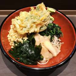 いわゆる看板メニューなんだと思いますが、「きつね、たぬき、温玉、かにかま、わかめ、ねぎ」と、なかなか豪華な盛り付け。